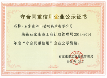日前,經(jīng)河北省石家莊市工商行政管理局審核批準(zhǔn),江山動(dòng)物藥業(yè)正式取得2013-2014年度“守合同重信用”企業(yè)公示資格。